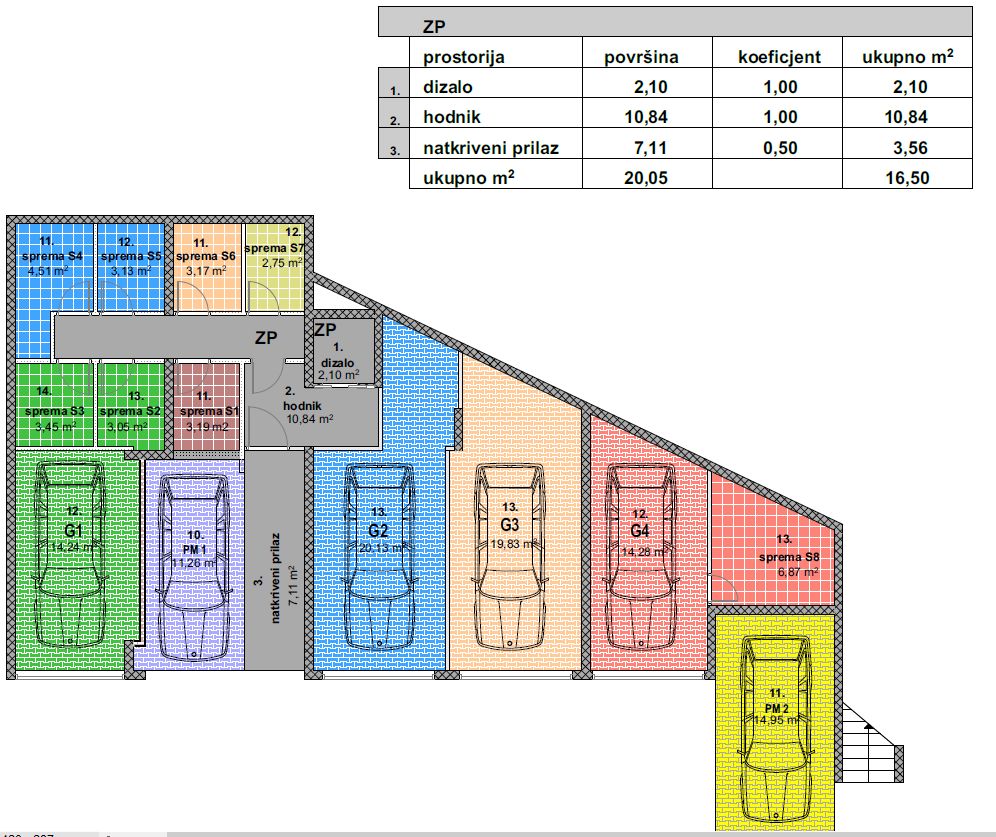 K bytu prináleží garáž o výmere 14,24 m2, vonkajšie parkovacie miesto a tri skladovacie miestnosti o výmere 3,05 m2, 3,45 m2 a 5 m2.