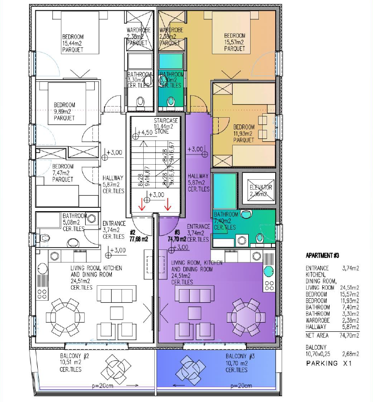 A3 – o celkovej rozlohe 85,40m2 sa nachádza na 1. poschodí a pozostáva zo: 2 spální, 2 kúpeľní, šatníka, chodby, spoločného priestoru kuchyne, jedálne a obývačky s výstupom na balkón. K apartmánu prislúcha 1 parkovacie miesto.