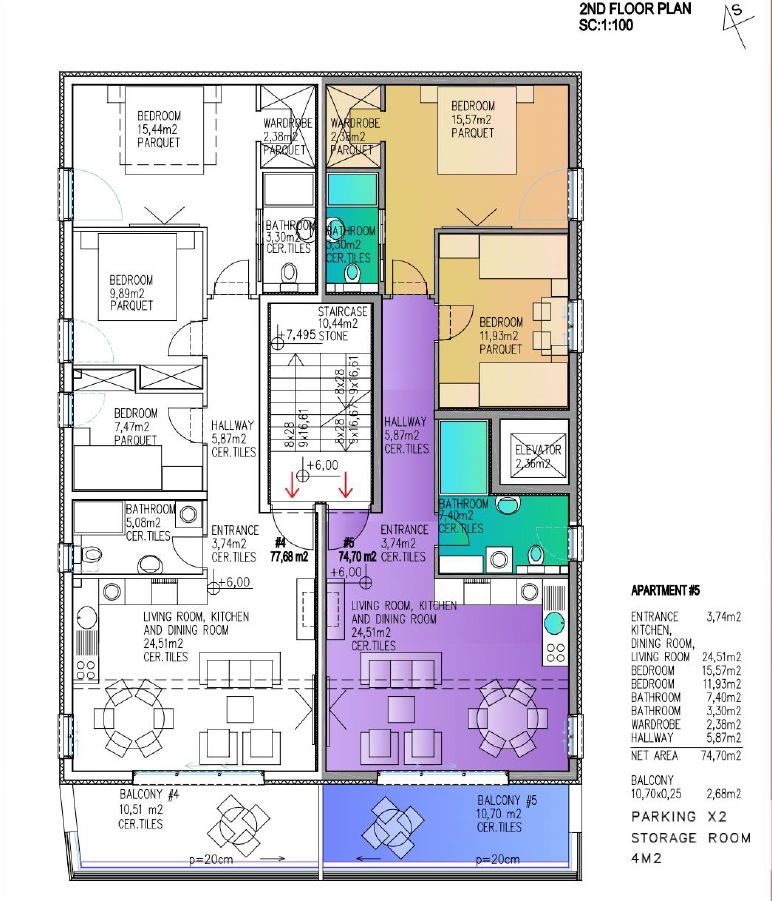 A5 – o celkovej rozlohe 89,40m2 sa nachádza na 2. poschodí a pozostáva zo: 2 spální, 2 kúpeľní, šatníka, chodby, spoločného priestoru kuchyne, jedálne a obývačky s výstupom na balkón. K apartmánu prislúcha 1 parkovacie miesto a sklad.